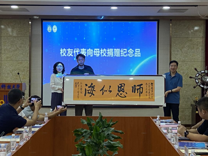 随后,青岛英通信息技术有限公司总经理刘鹏校友发言,他表示要充分发挥母校与校友之间的桥梁和纽带,凝聚校友智慧与力量,促成更多合作,为母校和学院的发展做出更大贡献。最后,校友代表向母校捐赠纪念品并合影留念。