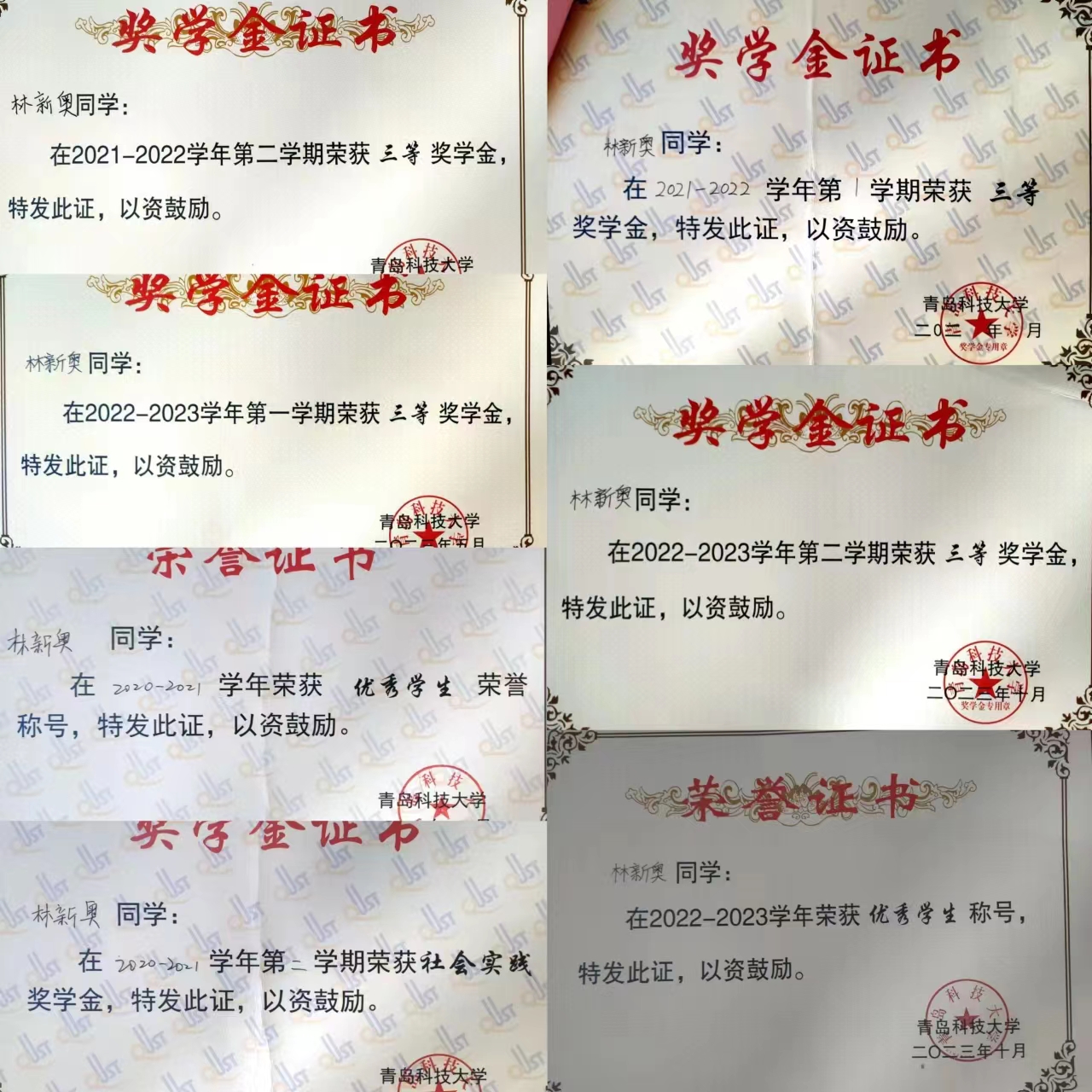 青岛科技大学校内三等奖学金五次;