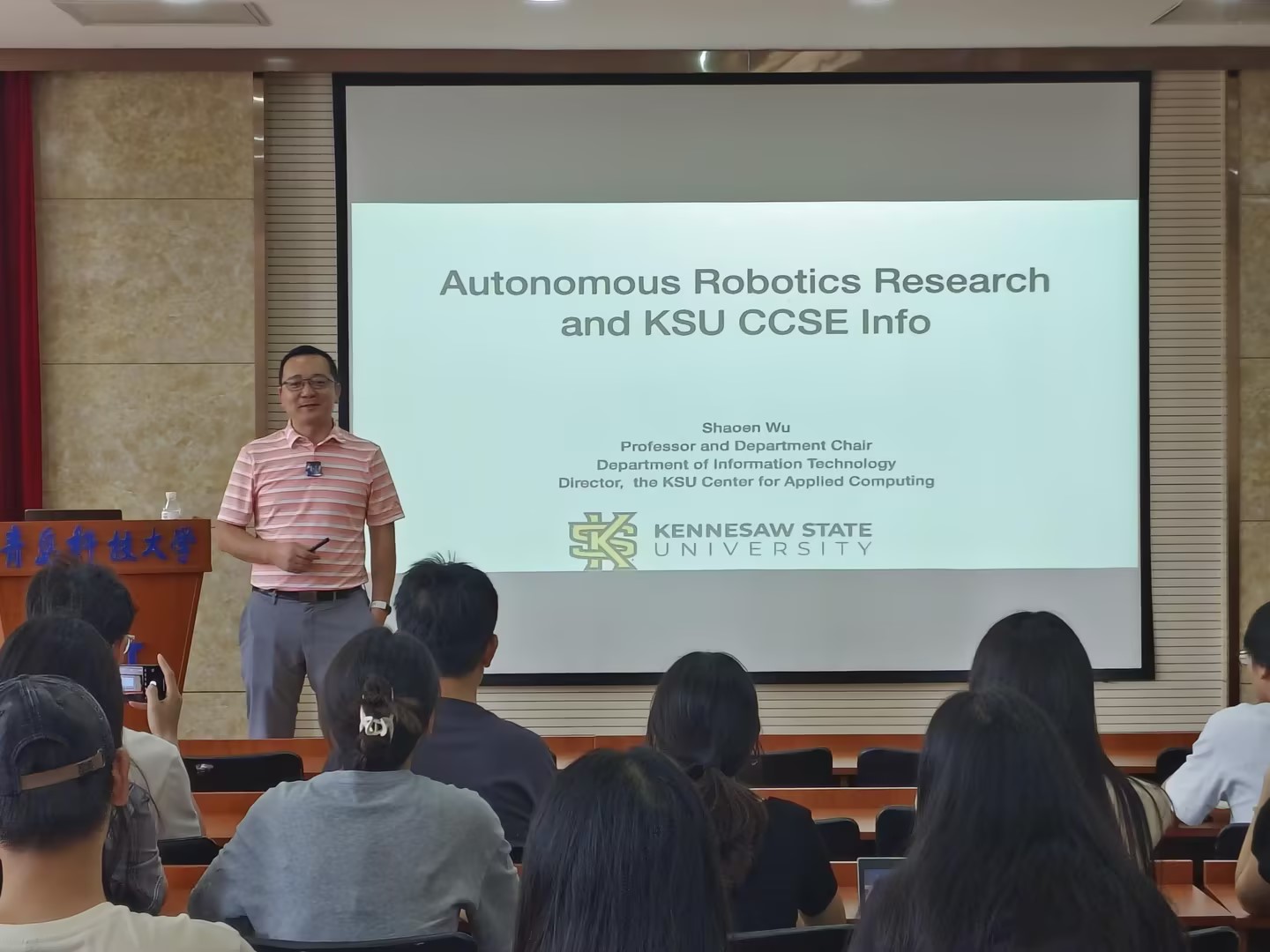 自主机器人在互联工业应用中有广泛的应用前景。伍绍恩教授在报告中,介绍了基于零样本模仿学习策略的跨模态推理模型,以及如何通过构建基于Unity3D的虚拟仿真系统,提供高精度的物理特征(重力、外观等)模拟环境,为机器人的训练与测试提供虚实融合的平台。最后,伍绍恩教授从学校历史、学习环境、培养方式和未来发展等方面,向在场有出国读研意向的学生介绍了Kennesaw State University的情况,并从如何开始申请、申请流程以及成功申请技巧等方面进行了详细地解读。