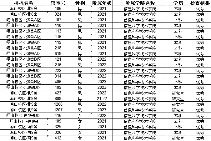 为进一步加强学生宿舍内务卫生和安全文明创建,强化学生宿舍安全意识,营造一个安全舒适、整洁优雅、文明和谐的宿舍环境。5月15日,学生工作处、后勤管理处及各学院开展了学生宿舍卫生安全秩序大检查。本次共抽查免费德州扑克 宿舍148间,24间宿舍获评“优秀宿舍”,优秀率16.22%,合格宿舍124间,合格率83.78%,无不合格宿舍。优秀宿舍详见名单。